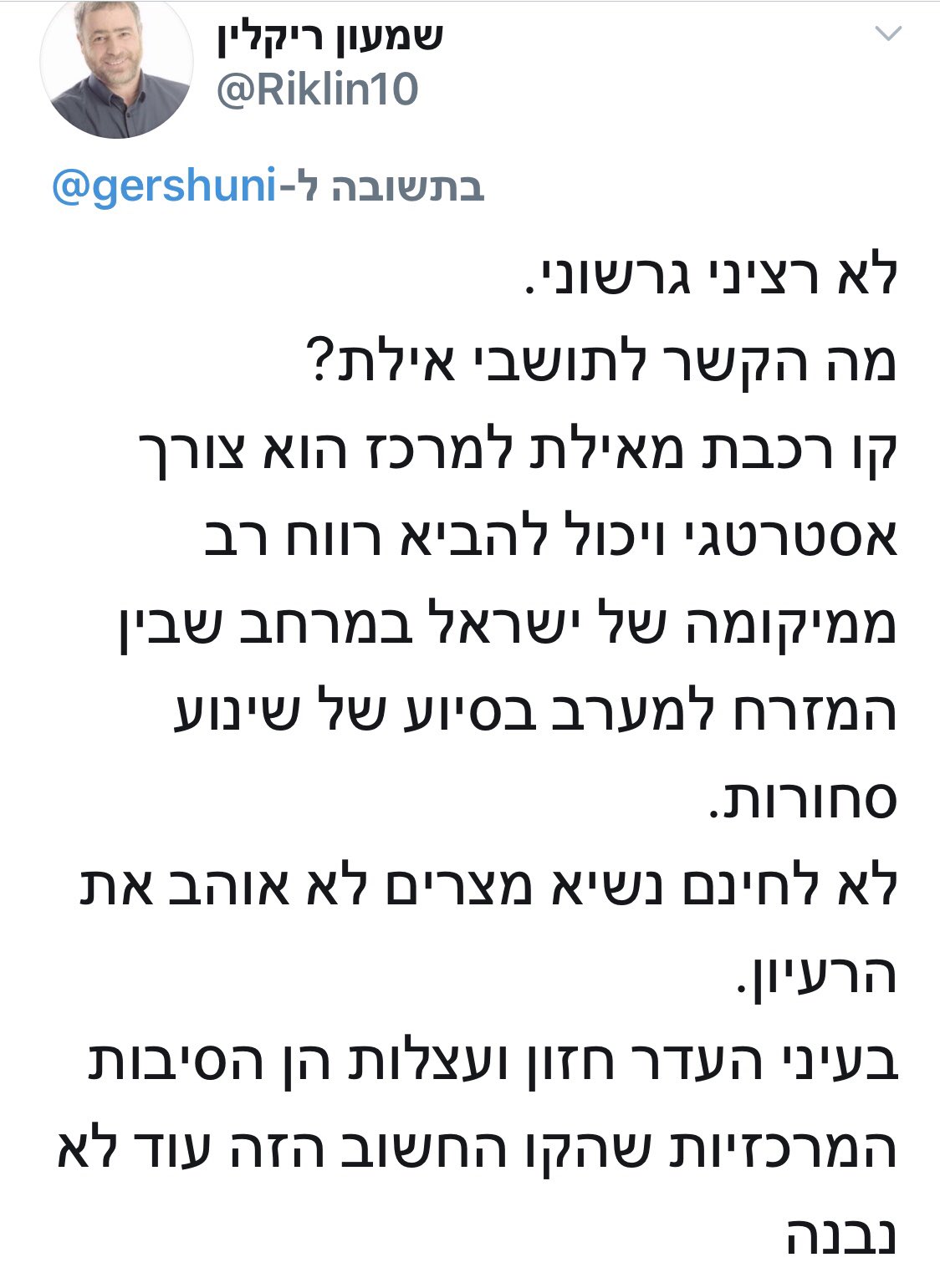 O Xrhsths שמעון ריקלין Sto Twitter שלום לשרה מירי רגב ההתבטאות שלך לגבי ביטול המטרו בתל אביב כי פריפריה רעה מאוד ואינה קשורה גוש דן פקוק וחייב פתרון תחבורתי מקיף לא קשור לקוצר הראות של פוליטיקאים ופקידים באוצר הנה לדוגמא מה שכתבתי על רכבת לאילת לפני כשנה וחצי